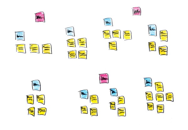 Similar to brainstorming, as much information and terms as possible are collected on cards (or post-its). Similar terms are sorted into corresponding groups. For the groups suitable generic terms are searched. For many terms additional subgroups can be formed. The groups are presented in a clear format on a board. If necessary, additional symbols (rings, clouds, arrows, etc.) can be drawn around groups or subgroups to clarify relationships. Based on the sorting, a final diagram is created or drawn. The resulting diagram can be summarized in writing. The formulation should be as neutral as possible and be done with little interpretation of the writer.